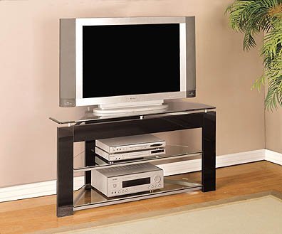 Powell Glossy Silver TV StandThe sleek glossy black face of this stand makes it look as though it is floating in space while it enhances your viewing experience. Heavy duty tubular steel construction, glossy silver powder coat metal finish with black polyurethane finished mdf face and back, tempered clear glass top, mid and base shelves with an easy wire management system integrate top quality functionality and this standÆs contemporary style. This stand will support plasma, DLP, LCD and standard TVÆs up to 300 lbs and 48ö wide. Adjustable levelers included. Some assembly required..../ Powell Glossy Silver TV Stand / Plasma Stands